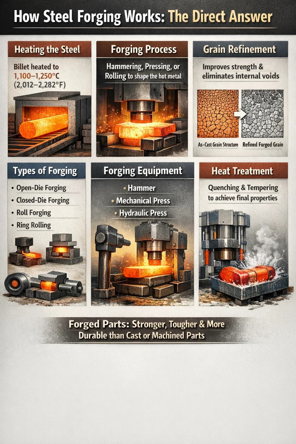 Стальная поковка Это процесс формования стали путем приложения сжимающей силы — посредством ковки, прессования или прокатки — при этом металл нагревается до температуры, которая делает его пластичным и работоспособным, но не расплавленным. Результатом является часть с превосходные механические свойства по сравнению с литыми или обработанными деталями, поскольку процесс ковки улучшает внутреннюю структуру зерен и устраняет внутренние пустоты.