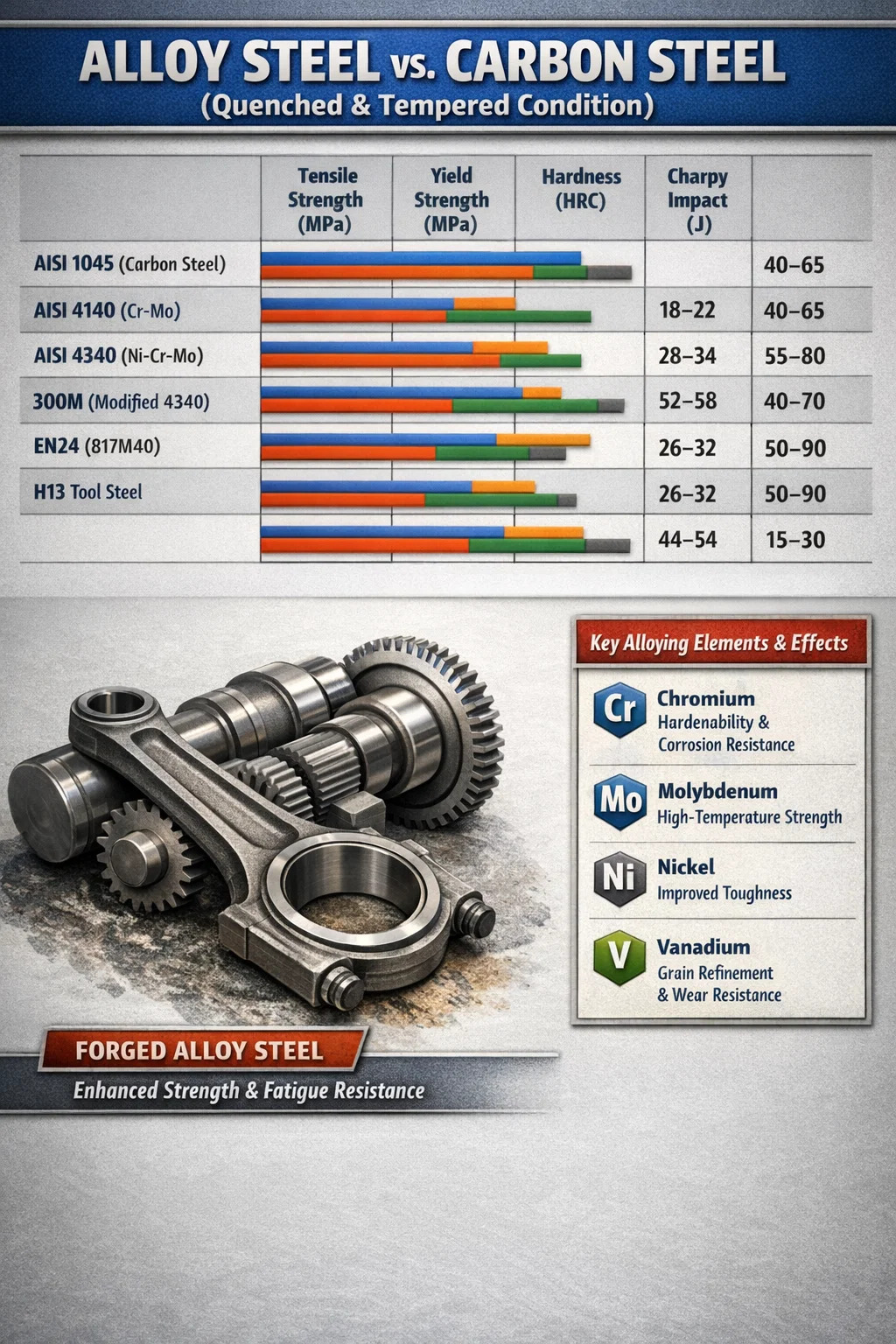 Слово «легированная сталь» охватывает широкую семью сталей. Их объединяет преднамеренное добавление легирующих элементов — хрома, молибдена, никеля, ванадия, марганца, кремния или их комбинаций — в количествах, превышающих содержание стандартной углеродистой стали. Каждое дополнение служит определенной цели: хром повышает прокаливаемость и коррозионную стойкость, молибден улучшает жаропрочность и предотвращает отпускную хрупкость, никель повышает ударную вязкость при низких температурах, а ванадий измельчает размер зерна, одновременно повышая износостойкость. В результате получается материал, который превосходит углеродистую сталь практически во всех механических категориях за счет более высокой цены на сырье и более жестких требований к термической обработке.
