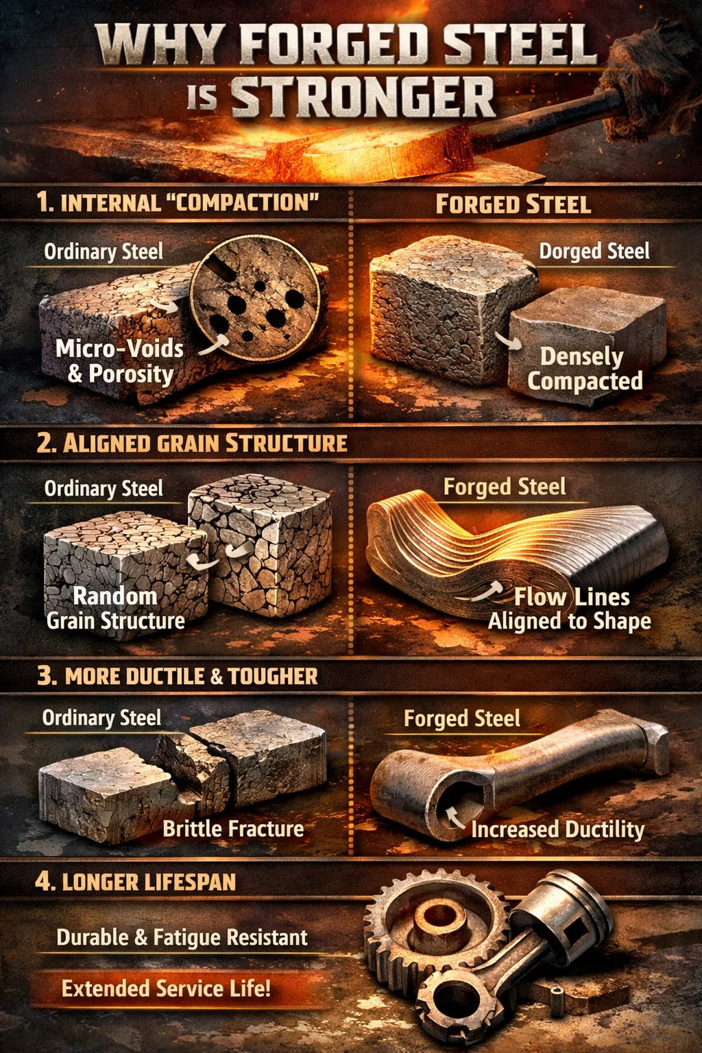 Кованая сталь: под огромным давлением эти маленькие поры полностью сплющиваются и свариваются вместе, делая весь кусок металла плотным, как цельный блок. Без внутренних дефектов деталь естественно прочнее.