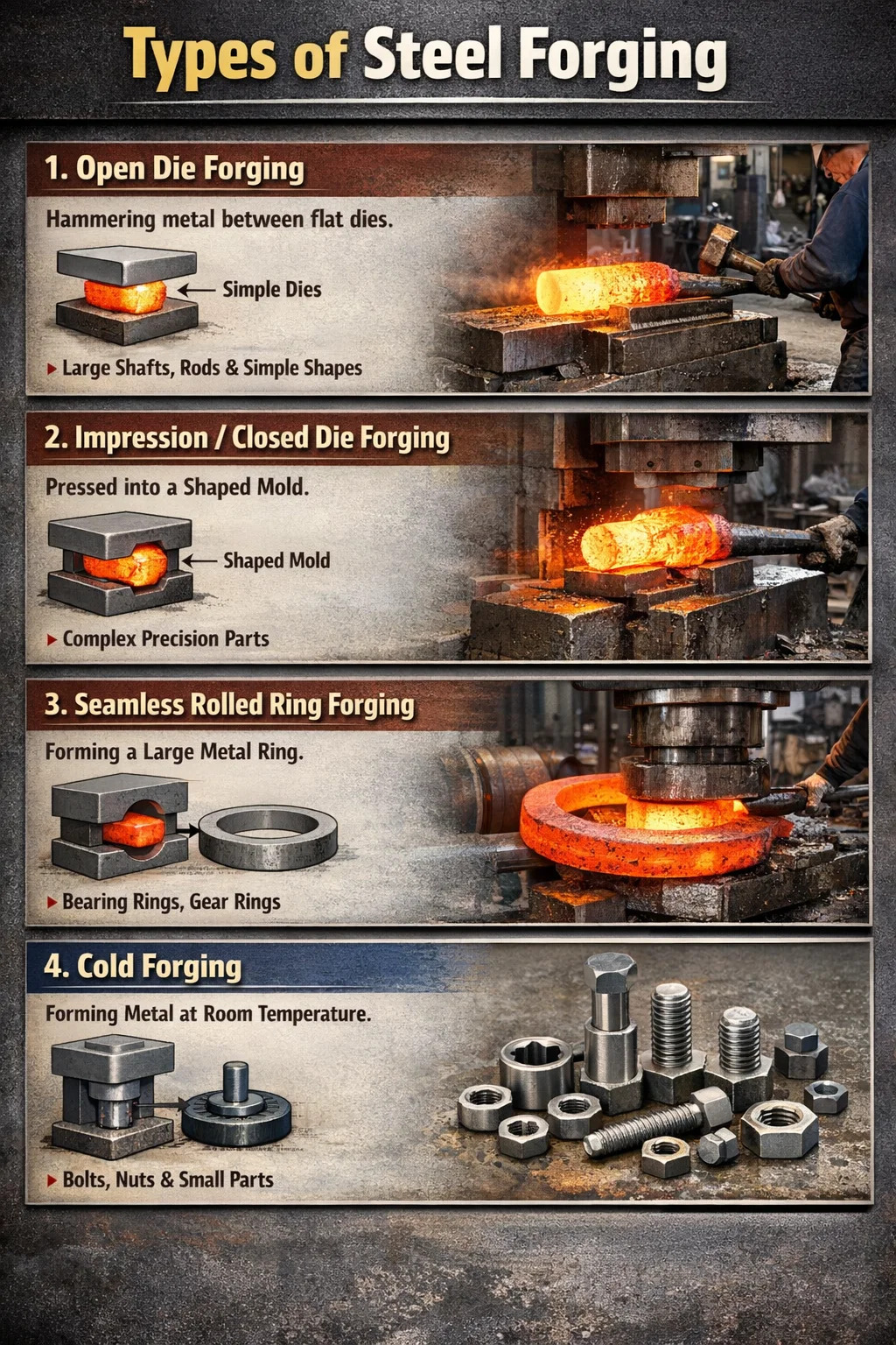 В области обработки металлов существует множество различных процессов ковки. Согласно наиболее распространенному методу классификации, стальная ковка обычно можно разделить на следующие четыре категории:
